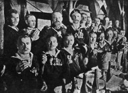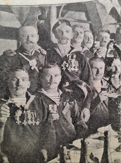 Экипаж канонерской лодки «Кореец» после награждения наградами за подавление Боксерского восстания. У нескольких матросов на груди на ряду с русскими наградами есть и прусские кресты