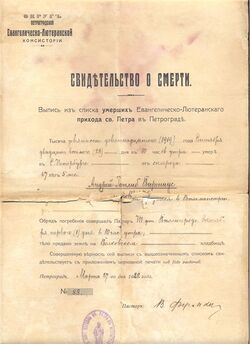 - ↑ По другим сведениям умер в г. Гатчина Детскосельского уезда Петроградской губернии.