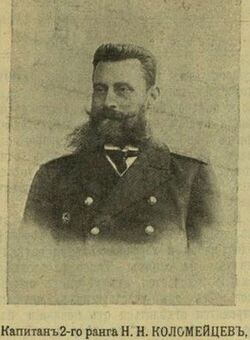 | ...капитан 2-го ранга Николай Николаевич Коломейцев, моряк тридцати восьми лет, высокого роста, статный, стремительно бегающий по палубе. Если бы кто-нибудь вздумал проставить приметы его лица в паспорте, то он написал бы так: худощавый блондин, проницательно-серые глаза, задумчивый лоб, прямой тонкий нос, маленький рот с плотно сжатыми губами, закрученные кверху усики, бородка плоской кисточкой. Но под этой обычной для многих офицеров внешностью скрывались непоколебимая сила воли, смелость и находчивость.