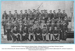 Команда шхуна «Заря». Слева направо: сидят: Безбородов, Евстифеев, Бегичев, Клюев, Огрин, лежит Толстов; стоят: Железников, Шервинский, Яскевич, Пузырев, Носов, Стрижев
