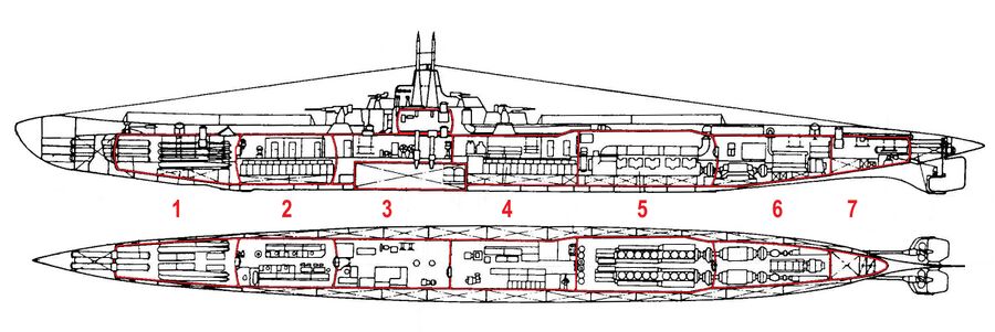 Корпус подводных лодок типа «К» разделялся на семь отсеков в которых находились: