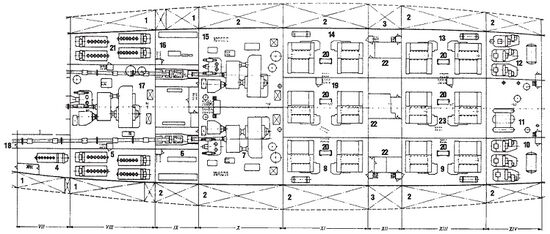 - ↑ Нумерация шпангоутов в немецком флоте традиционно велась с кормы в нос и была условной - через 1 метр, поэтому многие шпангоуты имели дробные номера. В данном случае цифра показывала расстояние в метрах от точки пересечения ахтерштевня с КВЛ.