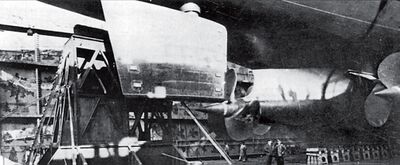 Перевернувшийся Tirpitz: вид на кронштейн правого гребного вала.