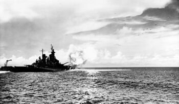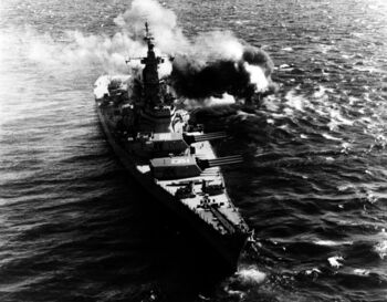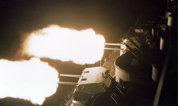 Линкор USS Missouri ведет огонь, 1945 г.
