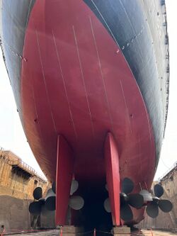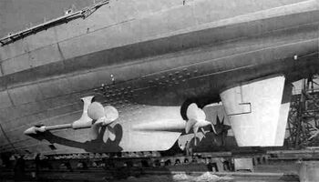 Корма USS Wisconsin, стоящего в плавучем доке USS AFDB-1. Гуам, 5 апреля 1952 г. Винто-рулевая группа корабля.