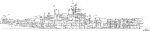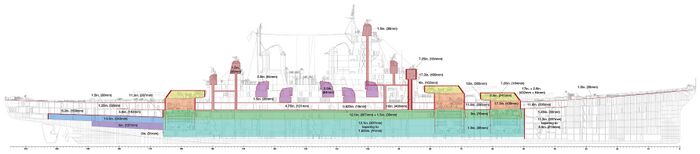 О системе бронирования линкоров типа Iowa написано множество всяческих небылиц. Что, в общем-то, неудивительно: корабли проектировались уже после начала Второй Мировой войны, и американцы не стремились раскрывать их подлинные характеристики. А те сведения, что просачивались в печать, зачастую являлись явной дезинформацией. Причем, если японцы имели склонность преуменьшать боевые возможности своих кораблей, чтобы их мощь стала для врага сюрпризом, то американцы поступали наоборот - для устрашения. Поэтому по многим солидным справочникам и монографиям долго «гуляла» совершенно фантастическая толщина броневого пояса кораблей типа Iowa в 457 мм - в полтора раза больше, чем в действительности. Когда же выяснилось, что опубликованные цифры, мягко говоря, завышены, некоторые зарубежные авторы ударились в другую крайность. Толщина бортовой брони теперь приводилась близкой к реальной, но при этом почему-то утверждалось, будто пояс стал наружным и лишенным наклона. То есть выходило, что вертикальное бронирование линкоров типа Iowa было самым слабым среди всех линкоров, построенных после Вашингтонского соглашения, и даже уступало большинству дредноутов. Однако все эти сведения оказались ошибочными - благо, сегодня американцам уже нет смысла хранить тайны 70-летней давности.