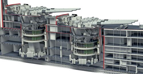 Броневые коробки 127-мм башен линкора USS Illinois.