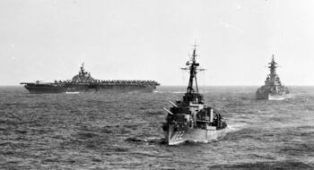 Линкор USS Missouri в штормовом море эскортирует авианосцы, .