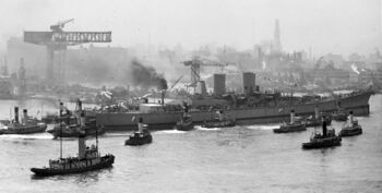 Буксировка корпуса USS Kentucky на разборку «Boston Metals Company» в Балтиморе, 31 октября 1958 г.