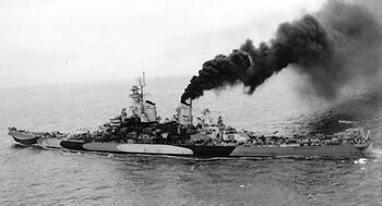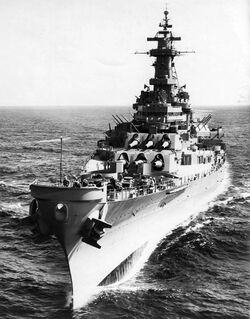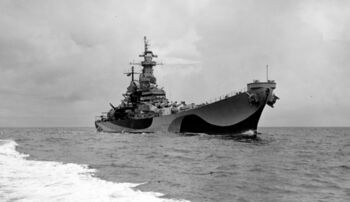 Линкор USS Wisconsin с поврежденным носом, 1950-е гг.