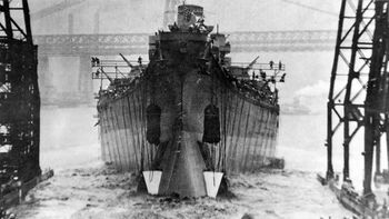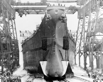 Корпус линкора USS Missouri перед спуском на воду. Верфь Нью-Йорка, январь, 1944 г.
