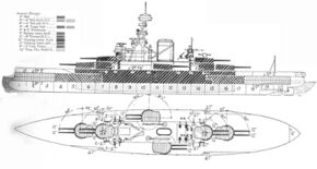 Образованная верхним поясом цитадель закрывалась сверху (на уровне верхней палубы) 38-мм броневой палубой (состоящей из двух 19-мм слоев). Вне цитадели поверх главного пояса шла плоская 51-мм броневая палуба.