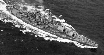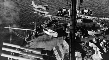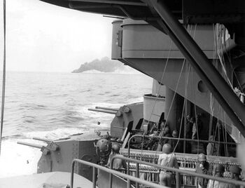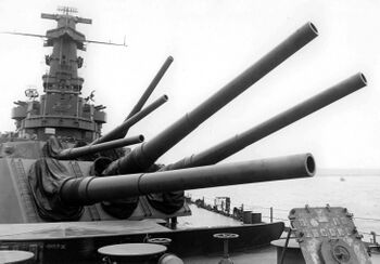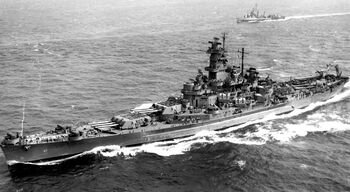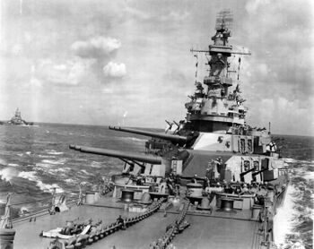 Линкор USS Indiana ведет обстрел Камайши, о.Хонсю. 14 июля 1945 г. Позади USS Quincy или USS Chicago.