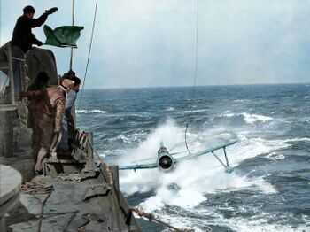 Линкоры USS Alabama и HMS King George V, авианосец HMS Illustrious у берегов Норвегии в июле 1943 г. В воздухе два «Seafire» и «Martlet». Акварель «Силы двух флотов» Dwight Shepler, МО США, 1943 год.