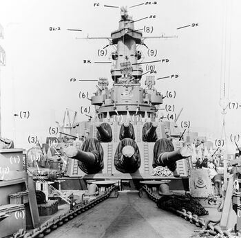 Когда в 1939 году Бюро вооружений[5] представило новый 1225-кг 406-мм снаряд, зона неуязвимости была пересчитана. Пояс и палуба сохранили часть своей эффективности (18 700 - 24 100 м), но башни с их 432-мм лобовыми плитами, наклоненными внутрь, могли пробиваться с максимальной дальности стрельбы - 38 100 метров. Лобовая броня башни была увеличена до 457 мм. В целях компенсации веса, толщина боковых плит башен была уменьшена с 254 до 241 до 9,5 дюймов за счет 16-мм подкладки MS.