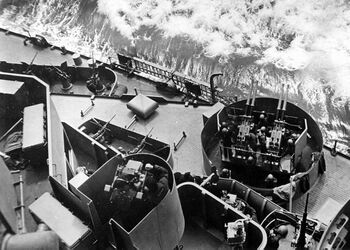 Линкор USS Indiana во время тайфуна. Окрестности Окинавы, 5 июня 1945 г.