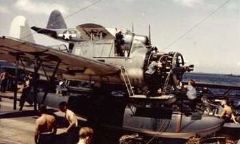 Перегрузка на USS Indiana 406-мм пороховых зарядов с корабля снабжения USS Wrangell. Окинава, 8 апреля 1945 г.