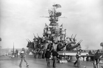 Линкор USS Alabama с борта авианосца, 1943 г.
