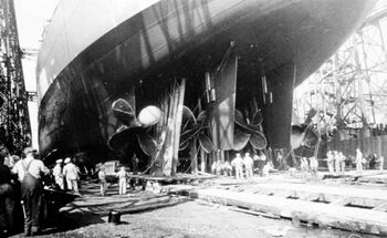 Необходимое сужение (фактически уменьшение площади поперечного сечения) в носовой и кормовой частях привело к дальнейшим осложнениям. В более традиционных конструкциях носовая часть корабля была почти вертикальной, что обеспечивало минимальное сопротивление под водой. Однако остойчивость[7] требовала максимальной площади ватерлинии, то есть как можно большей ширины как можно дальше вперед и назад. Таким образом, форштевень должен был наклоняться вверх и наружу, что увеличивало сопротивление и требовало большей мощности. Первая оценка веса показала, что это примерно на 300 тонн больше, чем нужно, и было еще хуже: 130 тонн для увеличения длины корпуса на 4,8 метра, 250 тонн для увеличения мощности на 20 000 л.с. Общий вес был примерно на 400 тонн больше, чем у 198,1-м проекта.