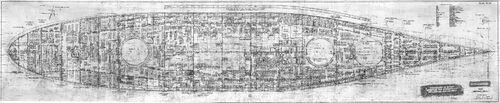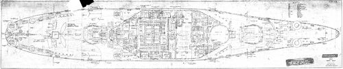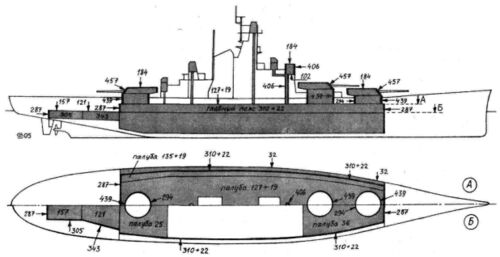 Необычный двойной пояс появился на самом раннем этапе проектирования (2 апреля), когда ширина зоны неуязвимости должна была составлять всего 4500 метров, и он сохранился на протяжении большей части предварительной стадии проектирования. В своем окончательном виде он состоял из верхнего пояса (переменной толщины от 292 до 330 мм) с наклоном в 44° наружу и нижнего (переменной толщины от 315 до 51 мм) с наклоном 15° внутрь. Основная бронированная палуба должна была иметь толщину 130 мм на 19-мм подкладке из стали STS[3] и была прикрыта прикрыта 37-мм «бомбовой» палубой. Поскольку она находилась полностью внутри основных противоторпедных переборок и, следовательно, больше не являлась жизненно важным элементом системы защиты от торпед, разделительную палубу можно было сделать однородной толщиной в 16 мм.
