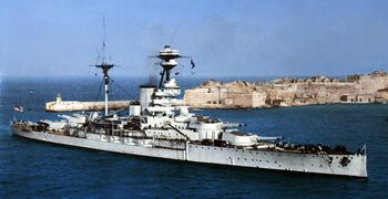 Линейный крейсер HMS Hood на Мальте, конец 1930-х гг. Возвышенная башня «B» окрашена в цвета «Нейтрального патруля» во время Гражданской войны в Испании..