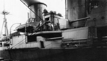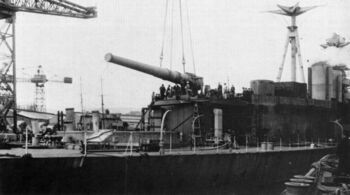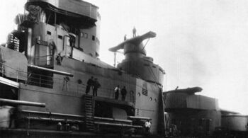 Носовые 381-мм башни и надстройка линейного крейсера HMS Hood. Веллингтон, Австралия, 1924 г.
