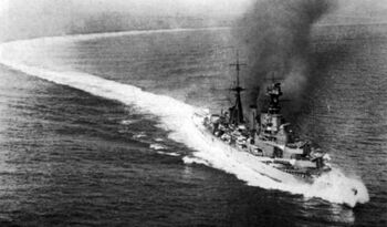 HMS Hood и HMS Valiant под итальянскими бомбами. Фото с борта HMS Ark Royal. 9 июля 1940 г.