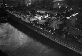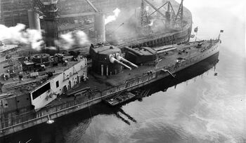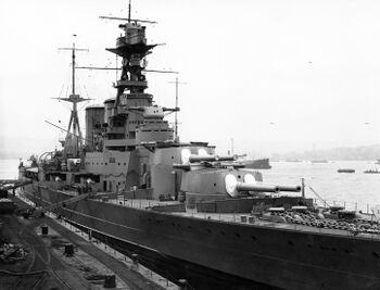 Линейный крейсер HMS Hood в гавани Портсмута перед ремонтом после столкновения с HMS Renown, 4 февраля 1935 г.