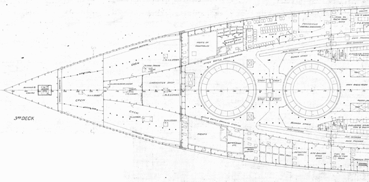 • первый уровень передней надстройки представлял собой палубу полубака. Включал в себя помещения, предназначенные для капитана и адмирала (приемные, кабинеты, жилые каюты), а так-же 4 орудия ПМК;