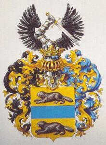 В золотом щите лазуревый пояс, сопровождаемый сверху и снизу бегущему вправо бобру натурального цвета с червлеными глазами и серебряными зубами. Щит увенчан дворянским коронованным шлемом.