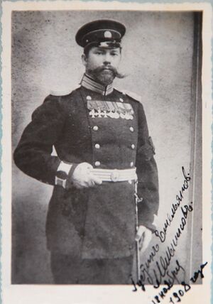 С 14 сентября по 5 октября и.д. субалтерн-офицера 7 роты и находился на передовой позиции около редута Тахэ. 21 сентября с первыми тремя взводами и 20 человеками от 4 взвода, под командой подполковника Малыгина, под неприятельским огнем пошел в атаку на Сигнальную гору около бухты Тахэ и с левого фланга горы с командой первый вбежал в окопы, выбил японцев и занял позицию. Около 8 часов вечера того же дня по приказанию подполковника Малыгина сдал позицию команде охотников военного ведомства. |