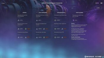 Получить эти бонусы можно за реактосплавы. Всего есть четыре категории бонусов (серебро, опыт командира, свободный опыт, реактосплавы). В первых трёх категориях есть по три типа бонусов, причём два из них обладают заметно повышенным заработком указанного ресурса, но при этом снижают заработок другого. В каждой категории может быть активен только один бонус (то есть поставить два бонуса на серебро не выйдет). Каждый бонус можно улучшить, чтобы увеличить заработок ресурсов ещё больше!