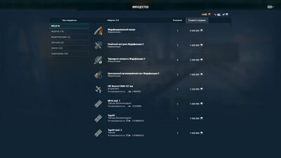 В нём представлено находящееся у игрока и не установленное на кораблях имущество, часть которого доступна для продажи.