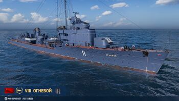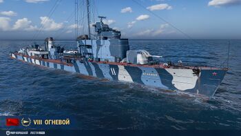 В версии 25.4, во время перевода «Огневого» в премиум статус, по техническим причинам до выхода 25.5 у корабля был однотонный серый «Штатный» постоянный камуфляж. С выходом версии 25.5 в игру вернулся привычный «Штатный» камуфляж.