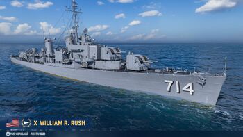 William R. Rush вооружён шестью 127-мм орудиями ГК в трёх башнях. Пушки обладают неплохой скорострельностью и, за счёт этого, достойным уроном в минуту при использовании как ОФ-, так и ББ-снарядов. Благодаря навесной траектории полёта снарядов эсминцу легко вести огонь через острова, но сложнее целиться и попадать при стрельбе на дальние дистанции. В арсенале корабля также есть один пятитрубный ТА. Торпеды по характеристикам похожи на торпеды Black — выделяются высокой дальностью хода и обладают быстрой перезарядкой. Так что они послужат скорее вспомогательным вооружением.