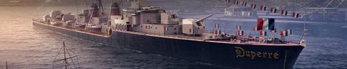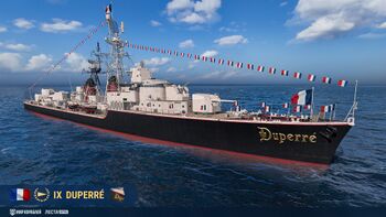 Это артиллерийский эсминец с шестью дальнобойными 127-мм орудиями. За счёт фирменного французского «Ускорения перезарядки ГК» эти пушки (которые, кстати, вы могли видеть на Marceau и Colbert) наносят достойный урон в минуту. Корабль также вооружён двумя трёхтрубными торпедными аппаратами. Торпеды выделяются не самой плохой скоростью хода и достойным уроном. За счёт особого распределения очков боеспособности в частях корабля и наличия «Ремонтной команды» (что для эсминцев редкость) у корабля весьма высокая живучесть. Duperré также оснащён «Боевым форсажем» с большим бонусом к скорости.