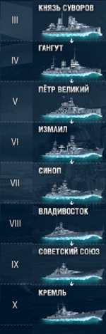 Имеется две ветки линкоров США, причем альтернативная начинается с VIII уровня, но можно выделить и начальный участок.