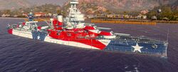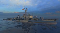 - ↑ Вначале был доступен североамериканским серверам с 1 Июля в честь Дня независимости США при покупке данного корабля. С 13 Июля (выход обновления 0.5.8.1) по 28 Июля (обновление 0.5.9) был доступен во вкладке «Камуфляж» раздела «Внешний вид» игрокам серверов СНГ за 1000 дублонов.