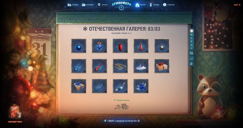 Количество игрушек в галерее напрямую влияет на новогодний бонус к кредитам и всем видам опыта. Бонус будет постепенно расти, пока вы не соберёте бóльшую часть игрушек.
