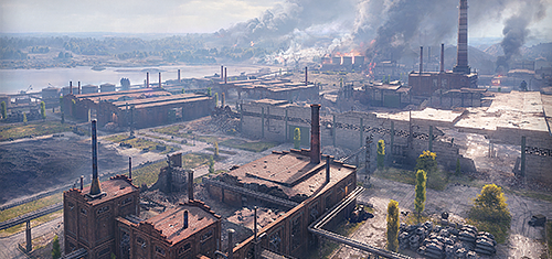 Это карта смешанного типа, на ней возможны как огневые дуэли на дальних дистанциях, так и скоротечные схватки среди разрушенных цехов промышленного производства.