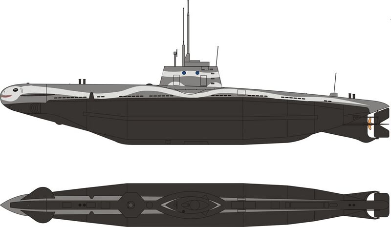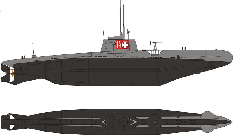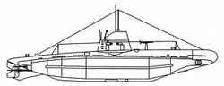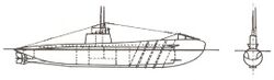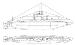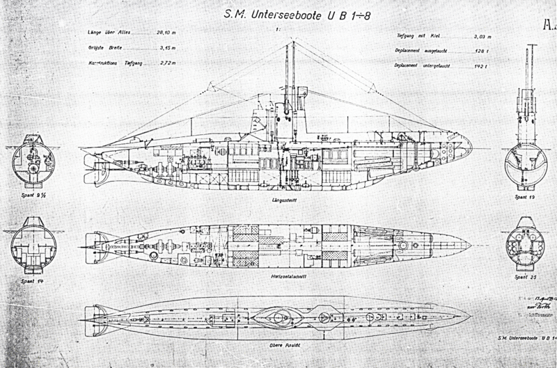 | Схема подводных лодок типа UB I постройки Germaniawerft. Чертеж применим к лодкам UB-1 — UB-8 |
