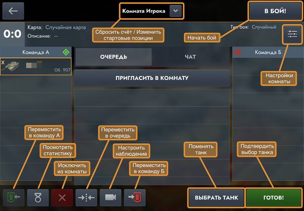 - Если все игроки в комнате нажали в правом нижнем углу кнопку «Готов!», можно начать бой по кнопке «В бой!».
