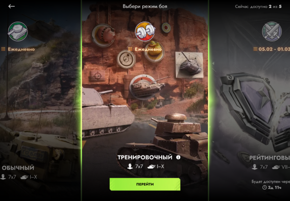 Тренировочные бои — постоянный режим боя, в котором ты можешь отточить свои навыки на любой технике и на любой карте из «рандома». В нём можно проводить турниры и тренировки с командой или просто осваивать игру: изучать разъезды, позиции; технику и её бронирование; проверять механики и особенности игры.