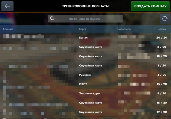 - Ты увидишь список всех тренировочных комнат, которые созданы другими игроками. Можешь найти подходящую тебе по названию и описанию в списке или по поиску и нажать на неё, чтобы присоединиться к ней. Также можно присоединиться к комнате, где есть твои друзья — такие комнаты отображаются всегда вверху списка.