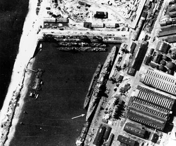 Аэрофотосьемка Готенхафена 10 октября 1943 г. Слева Prinz Eugen, справа Emden..