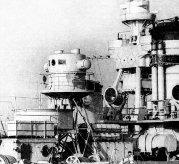 Треногая грот-мачта была возведена перед второй дымовой трубой. На ее площадках размещались посты управления противовоздушной и противоминной обороны и два КДП среднего калибра. Между кормовой трубой и башней №3 размещался резервный КДП.