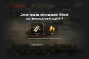 Все виды оборудования можно демонтировать: штатное и трофейное — за золото или с помощью демонтажного набора, усовершенствованное — за боны. Оборудование можно также уничтожить — оно будет снято с выбранной техники и уничтожено.