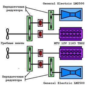 Форсажные ГТД расположены в носовом машинном отделении, в кормовом - маршевые ГТД с самосинхронизирующимися муфтами, главными редукторами и упорными подшипниками. ЭУ спроектирована с учетом безвахтенного обслуживания. В нормальных условиях контроль за ее работой осуществляют четыре человека. Главные и вспомогательные механизмы установлены на амортизированные фундаменты с использованием звукопоглощающих устройств и покрытий. Электросеть обеспечивают четыре дизель-генератора мощностью по 750 кВт (суммарной мощностью 3000 кВт).