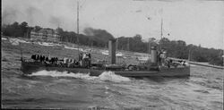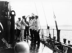 18-го мая, в 10 ч. утра, Его Высочество Эмир Бухарский в сопровождении свиты и лиц, назначенных состоять при Его Высочестве на время пребывания в России, отбыл из Зимнего Дворца на пристань, с которой проследовал на эскадренный миноносец «Эмир Бухарский», взявший курс по Морскому каналу к Кронштадту. На миноносце Его Высочество, встреченный начальниками: Главного морского штаба, контр-адмиралом Князевым и 1-й минной дивизии контр-адмиралом светлейшим князем Ливеном и командиром миноносца, капитаном 2-го ранга Лепко, обходил, здороваясь, команду миноносца, после чего Его Высочеству были представлены офицеры миноносца. Затем Эмир Бухарский поднялся на верхнюю рубку миноносца, где оставался в течение всего путешествия. Выйдя из Морского канала в море и проехав некоторое расстояние, миноносец возвратился обратно в Морской канал, где Его Высочество перешёл на яхту морского министра «Нева». На яхте Эмир Бухарский, встреченный морским министром вице-адмиралом Григоровичем, здороваясь, обошел фронт команды яхты. После представления Его Высочеству офицеров яхты, Эмир Бухарский с лицами свиты присутствовал на завтраке в кают-кампании офицеров. Затем Его Высочество на яхте морского министра «Нева» возвратился в третьем часу дня в С.-Петербург. | ![]() |