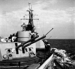 - Топливные цистерны, артпогреб 76-мм выстрелов, пост управления артиллерийским зенитным огнём, кубрик команды №5;